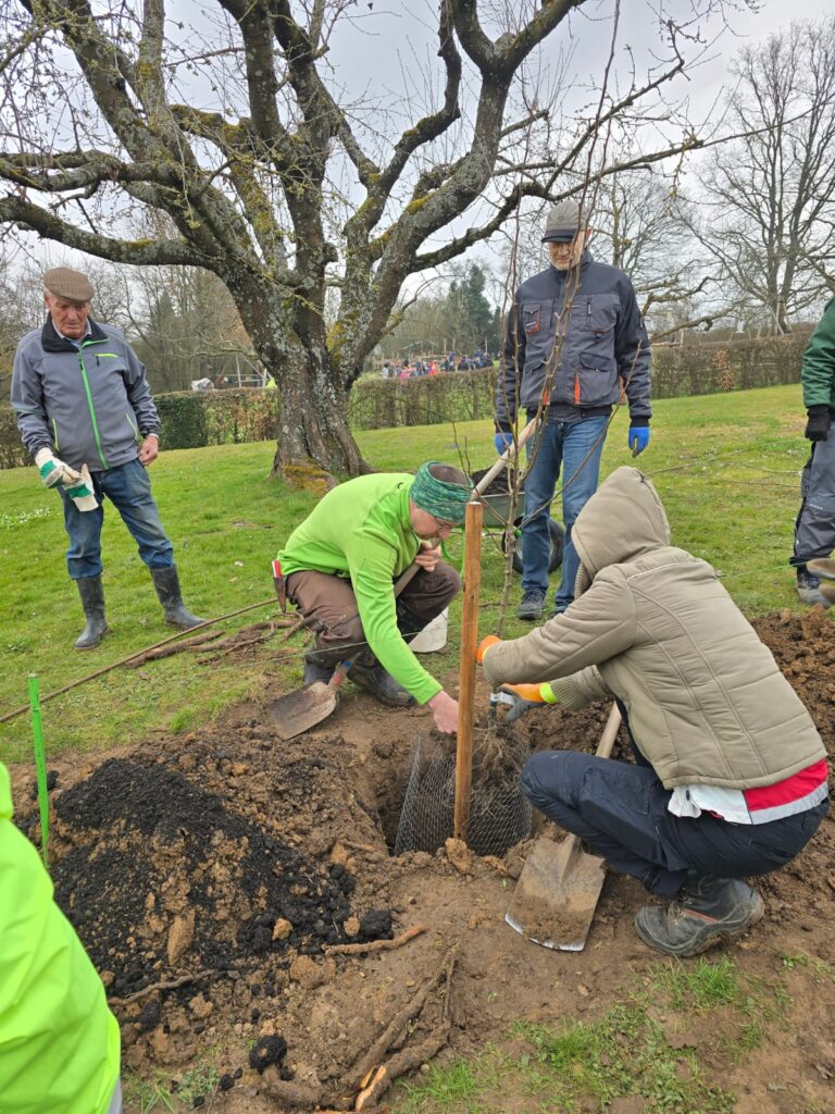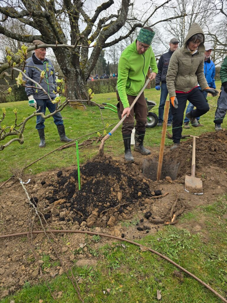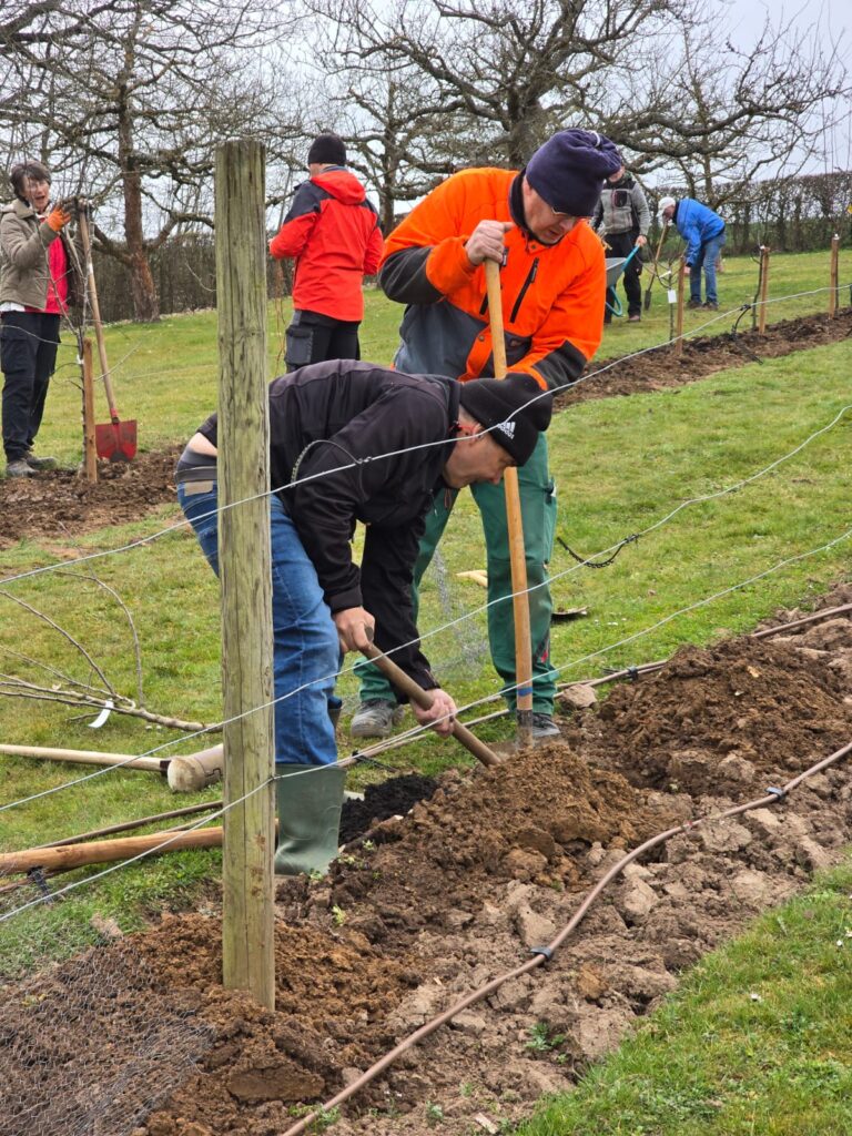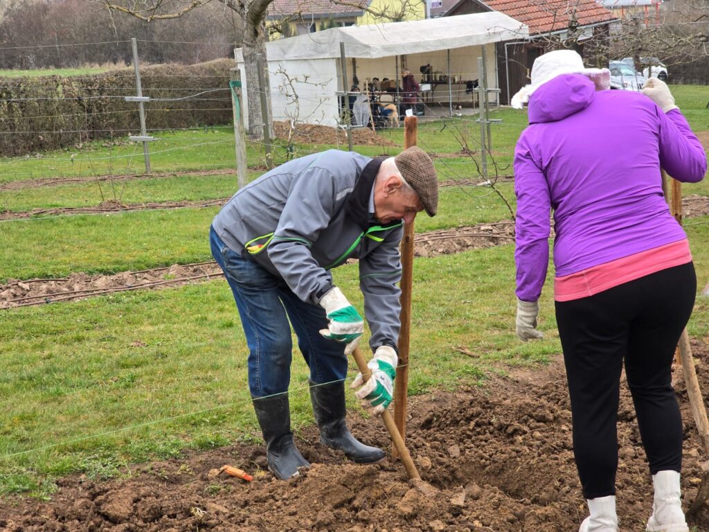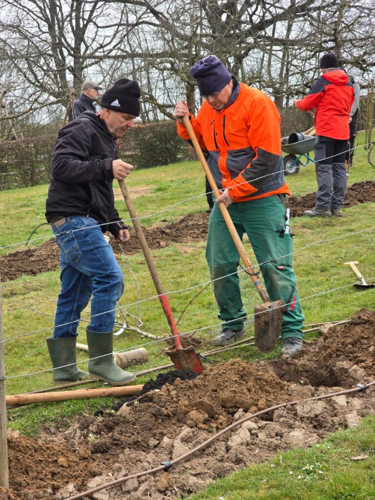Die Aktion war ein voller Erfolg, mehr als 25 engagierte Helferinnen und Helfer kamen zusammen, um tatkräftig mit anzupacken. Bei bestem Pflanzwetter wurde nicht nur fleißig gegraben, gehackt und gepflanzt, sondern auch Wühlmauskörbe aus Draht geflochten, um die jungen Bäume vor Schädlingen zu schützen.