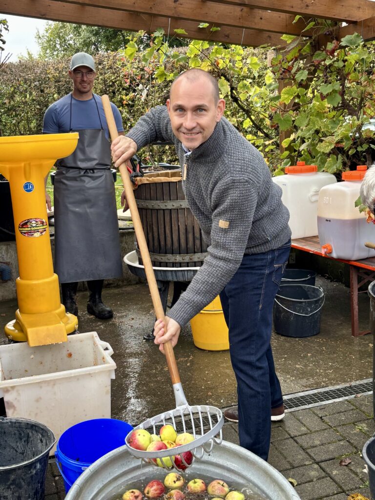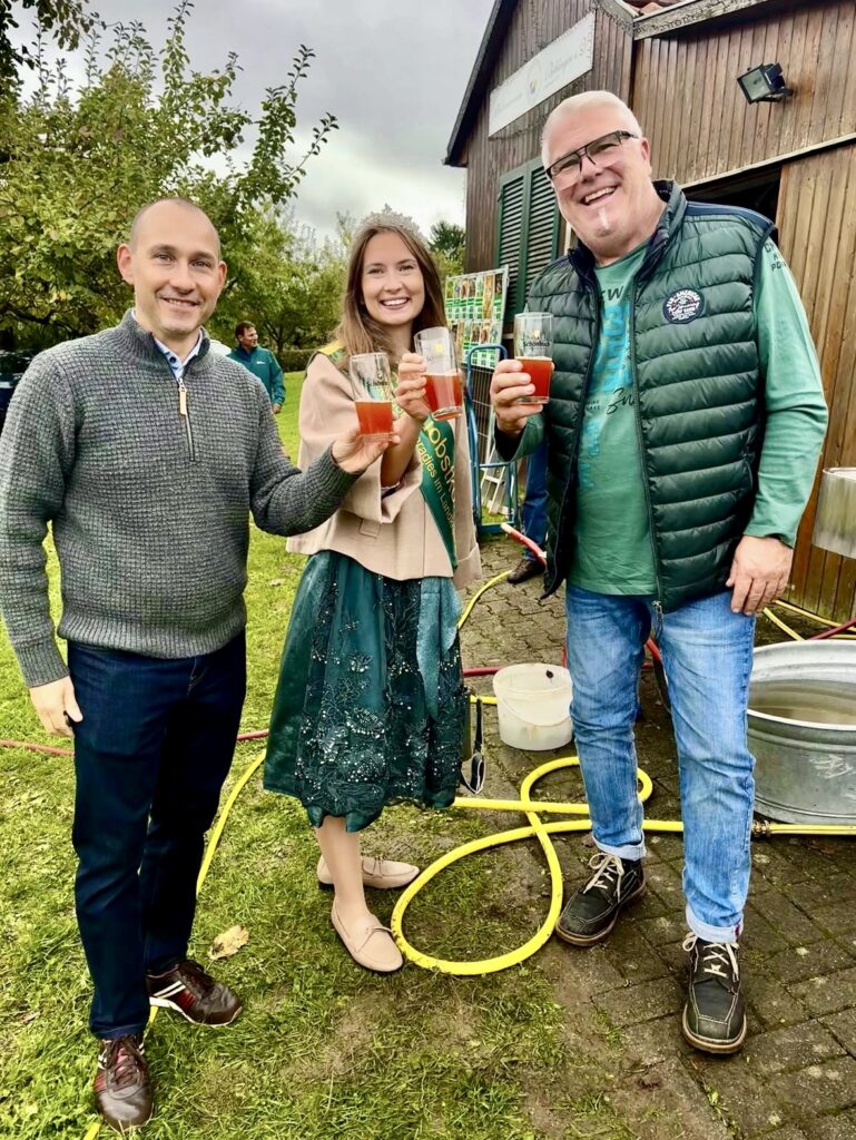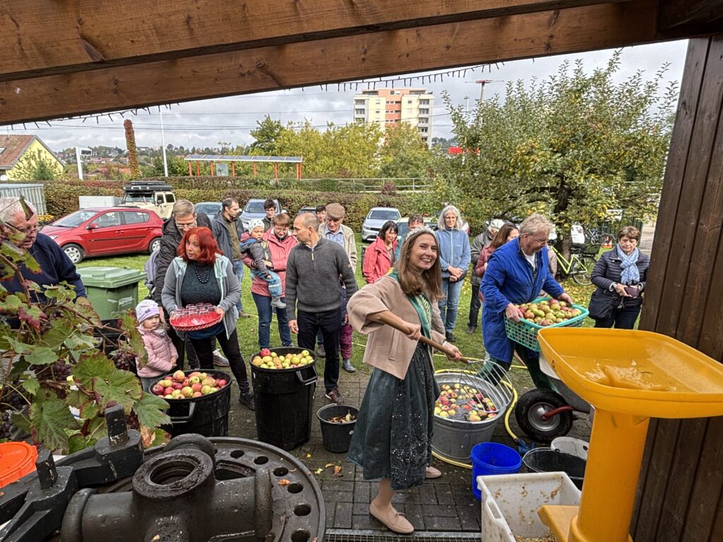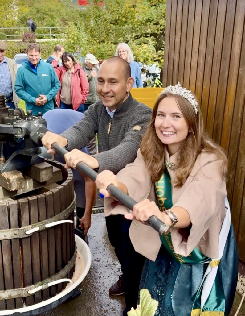 Ein besonderes Highlight war der Besuch von Oberbürgermeister Dr. Stefan Belz und Streuobstkönigin Linda Oesterle die nicht nur als Ehrengäste kamen, sondern auch selbst tatkräftig mit anpackten. Beim Apfelsaftpressen zeigten beide großen Einsatz und begeisterten damit das Publikum – ein schönes Zeichen für die Verbundenheit von Stadt, Tradition und Ehrenamt.